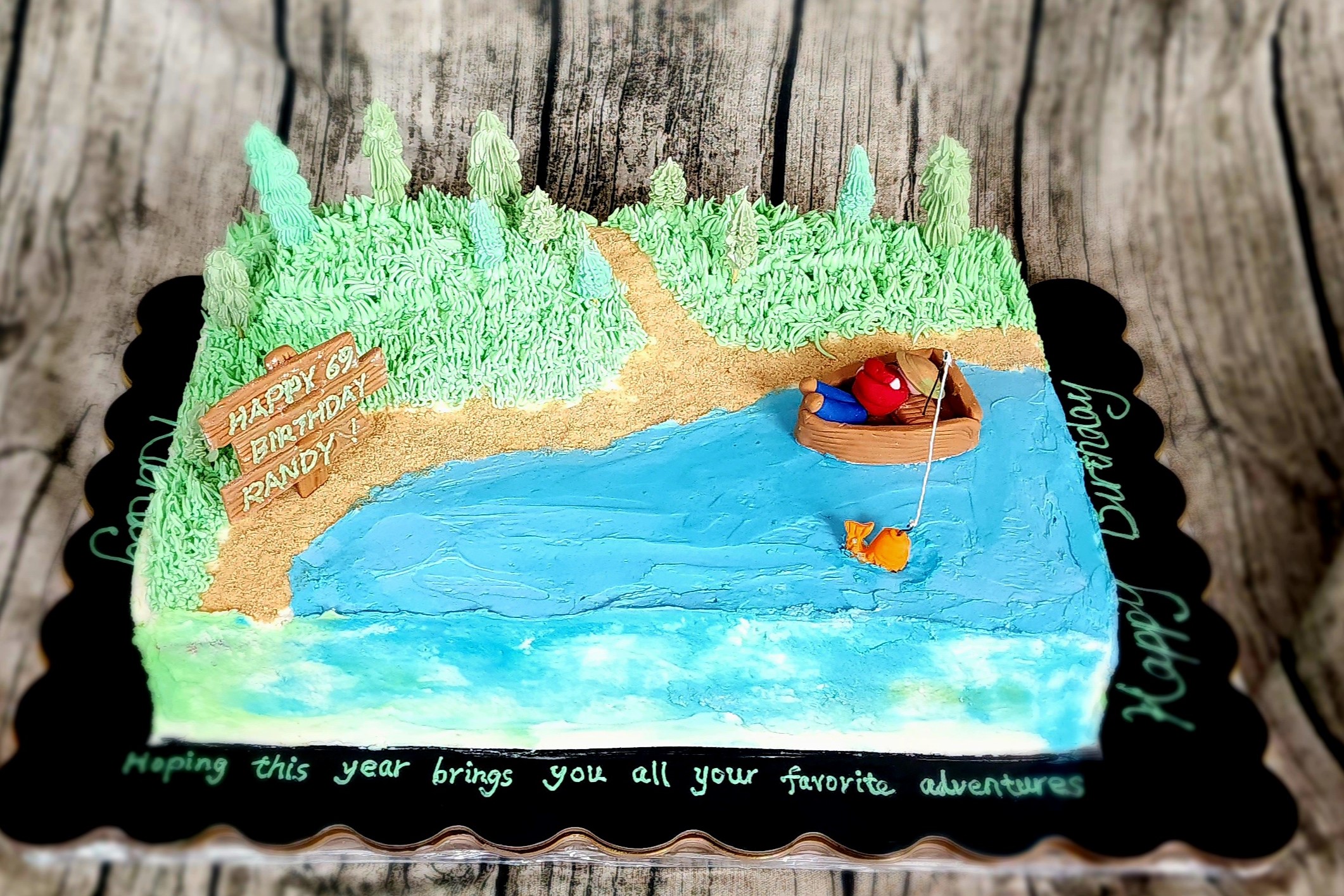 A red velvet birthday cake for someone who loves fishing. The frosting is Swiss Meringue Buttercream, the boat, fisherman, and sign are made with fondant.